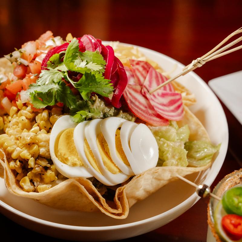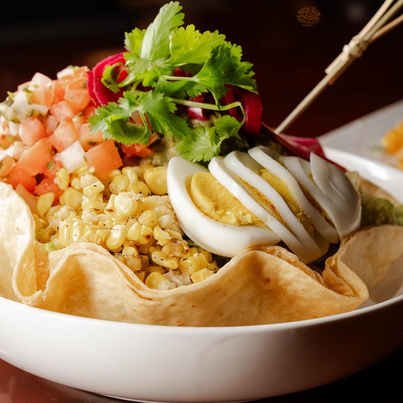 Romaine lettuce with house made Mexican ranch, topped with guacamole, fried tortilla shells, grilled corn, pickled red onions, boiled eggs, and mixed cheese