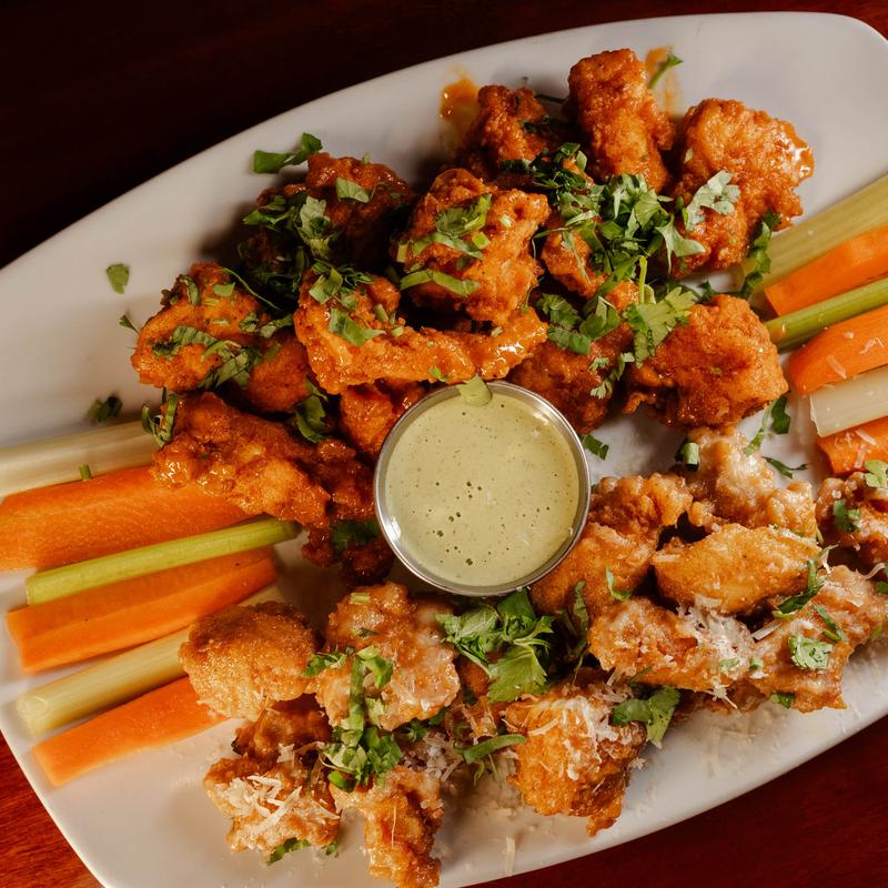 Tossed in our signature mild buffalo sauce - a smooth blend of buttery richness made with paprika, balsamic and other spices with just the right kick. Spice Level 1.5 of 5