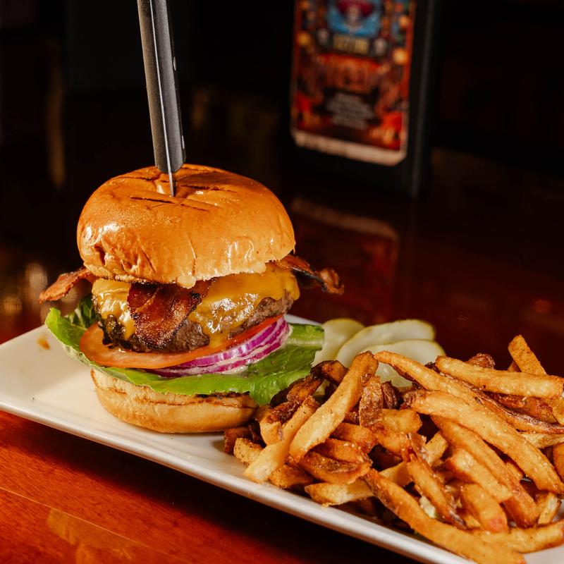 Four pieces of Applewood smoked bacon stacked high with cheddar cheese, lettuce, onions, tomato, pickles, bacon sauce