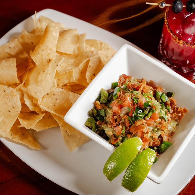 Our signature guacamole, with smoked bacon, poblano chiles, charred tomato salsa, and topped with cotija cheese | Add Chicharrons +$6.00