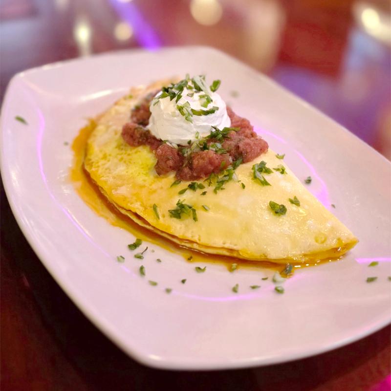 Smoked slow cooked lamb barbacoa with melted cheese, red pickled onions and cilantro • $15.75 | $22.00
