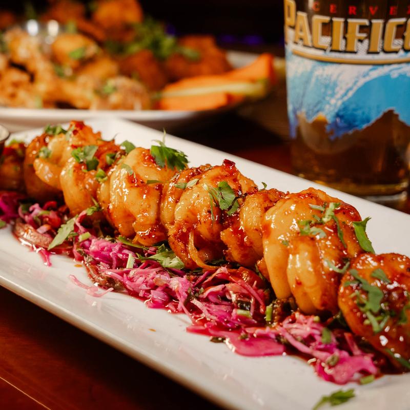 | Buttermilk fried shrimp on top of sweet and spicy slaw mix, Buffalo ranch, and pina salsa • $14.25 | $20.00