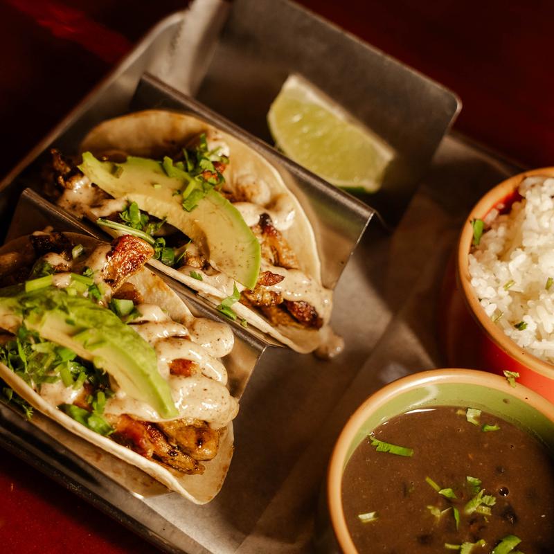 Three corn tortillas, with your choice of protein covered with Chihuahua cheese topped with pickled red onions, crema fresca, and cilantro and served with black beans and rice.